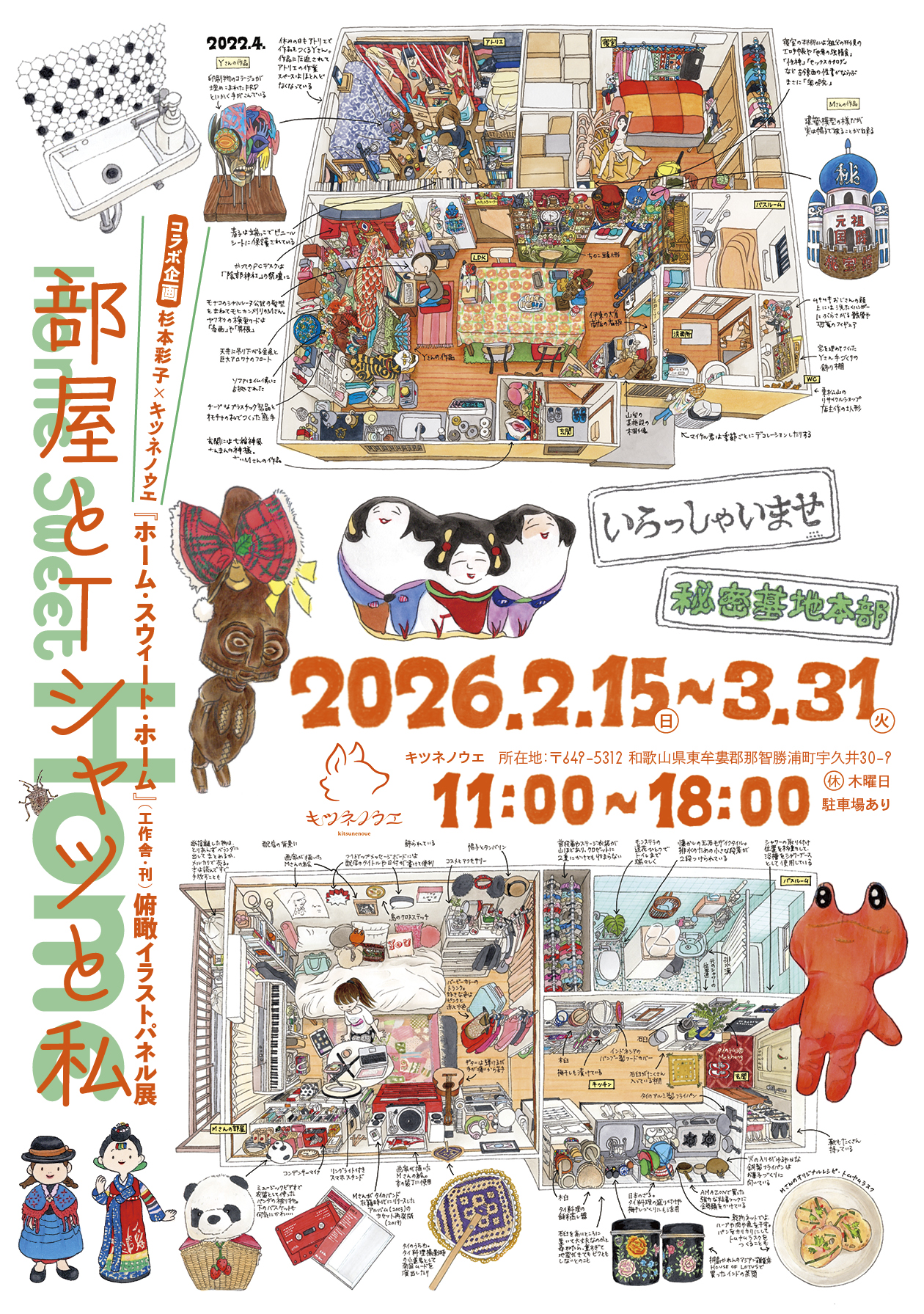 『ホーム・スウィート・ホーム』の魅力がギュッと凝縮したイラス トパネル展を、攻めたデザインが人気 のTシャツ屋さん「キツネノウエ」店 内の展示室で開催します。