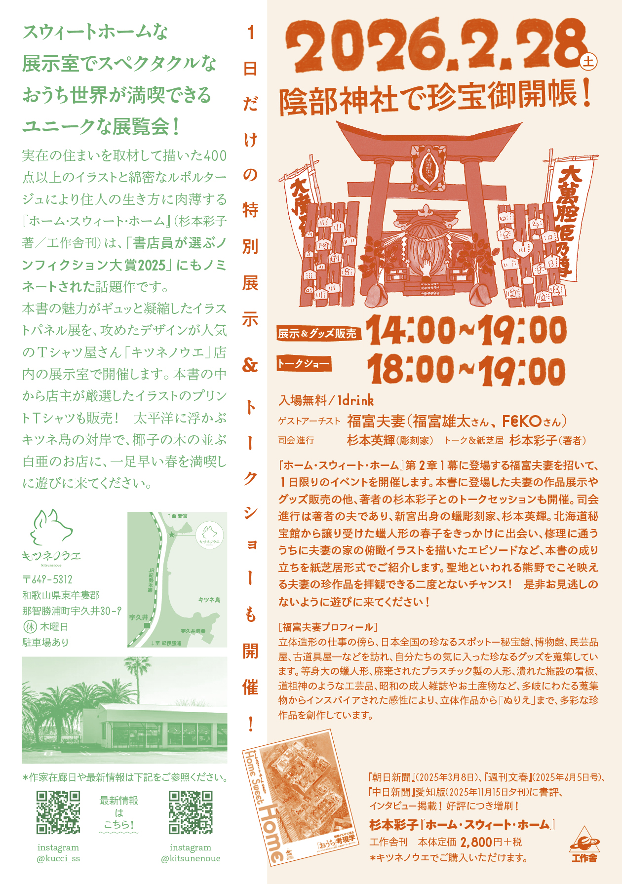 第2章1幕に登場する福富夫妻を招いて、1日限りのイベントを開催します。本書に登場した夫妻の作品展示やグッズ販売の他、著者の杉本彩子とのトークセッションも開催。司会進行は著者の夫であり、新宮出身の蠟彫刻家、杉本英輝。北海道秘宝館から譲り受けた蠟人形の春子をきっかけに出会い、修理に通ううちに夫妻の家の俯瞰イラストを描いたエピソードなど、本書の成り立ちを紙芝居形式でご紹介します。聖地といわれる熊野でこそ映える夫妻の珍作品を拝観できる二度とないチャンス! 是非お見逃しのないように遊びに来てください!